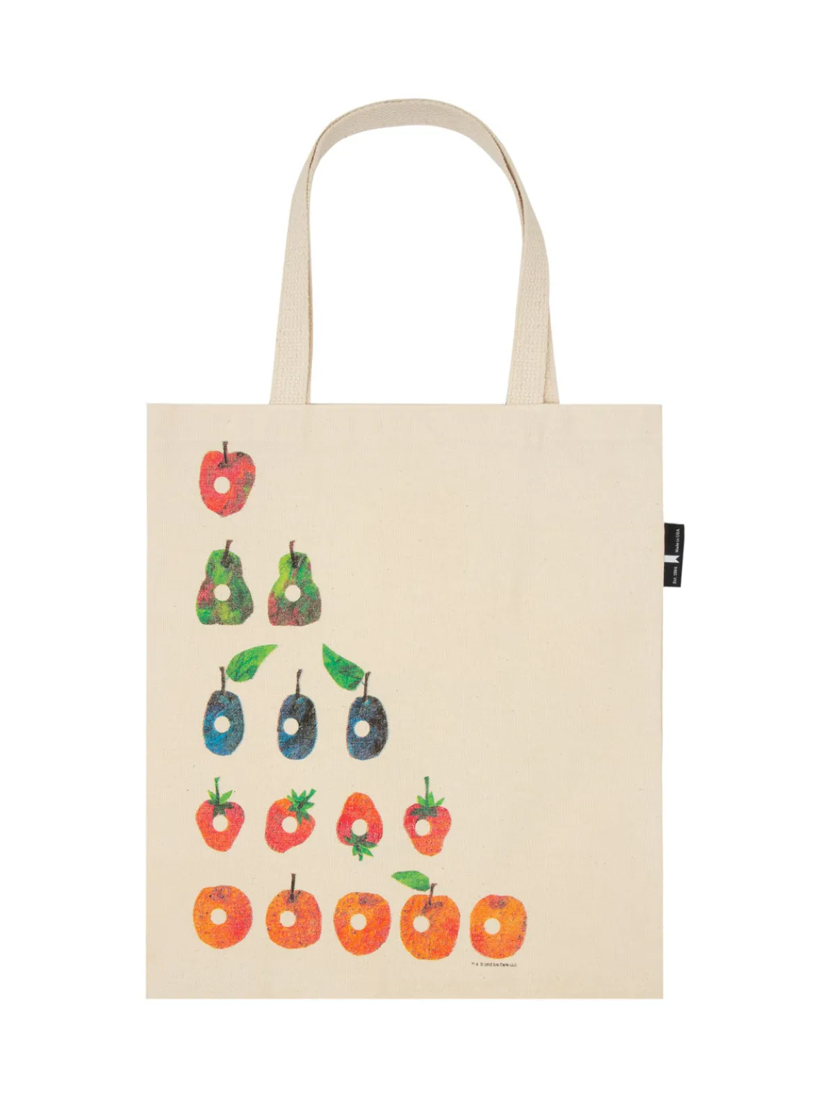 Double-sided tote bag featuring artwork from the first edition cover forThe Very Hungry Caterpillarby Eric Carle.