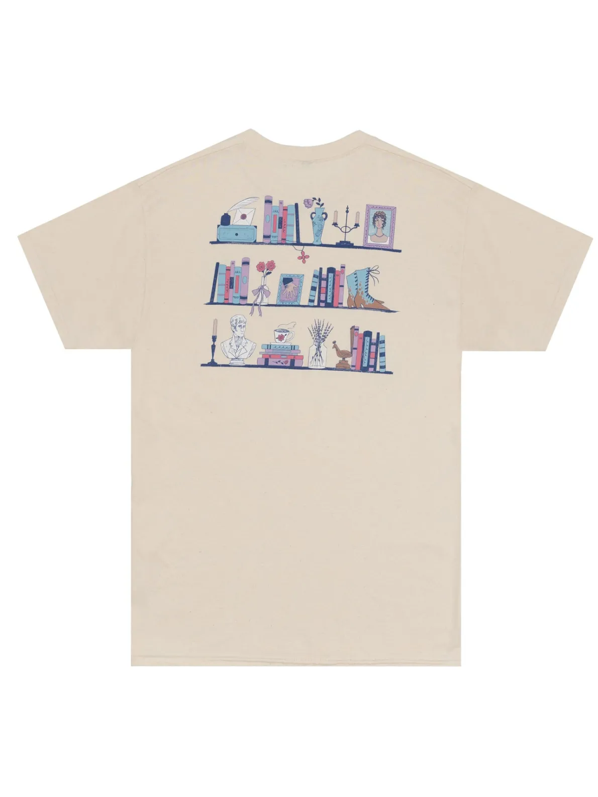 Introducing the Pride and Prejudice: Mr. Darcy Fan Club women’s t-shirt – a must-have for Jane Austen enthusiasts and literary lovers! This relaxed fit shirt features Mr. Darcy Fan Club emblem on the front and a charming bookshelf design adorned with classic Pride and Prejudice references on the back. Can you identify them all?